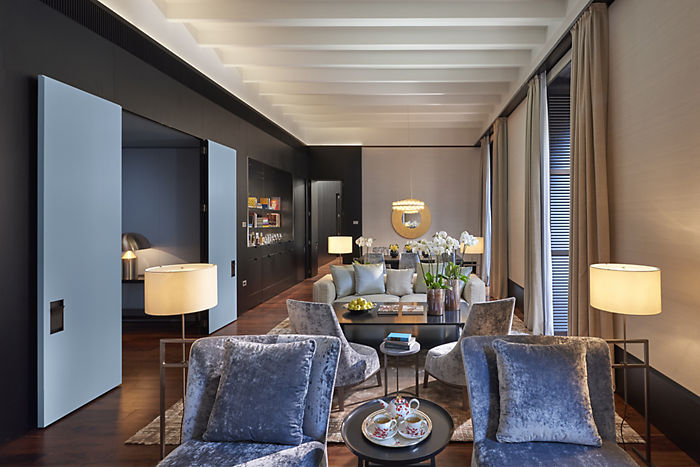 La delicada combinación de colores, los lujosos tejidos y las impresionantes alfombras se combinan para crear un ambiente sofisticado que refleja el estilo de Milán con un toque de Oriente. Además de un relajante dormitorio, un gran salón y una cocina privada, la suite cuenta con suelos de madera y está repleta de muebles a medida, como los armarios de roble negro, y la tecnología más avanzada, lo que la convierte en una de las suites más bonitas de la ciudad. Su espacioso y exclusivo baño tiene suelos de mármol brasileño, una gran bañera en el centro y una iluminación escenográfica.